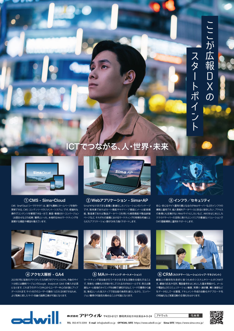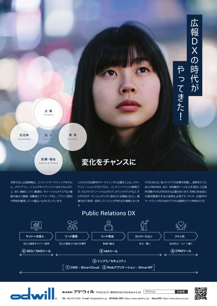 コロナ禍によって大きく変化したワーキングスタイルや、加速する働き手不足といった課題に対応する、ブランディング、マーケティング・プロモーションの「広報DX」を主軸に、クラウドを活用したオリジナルCMSやWebアプリケーションなど、貴社の業務課題に柔軟にマッチする解決策をご提案いたします。