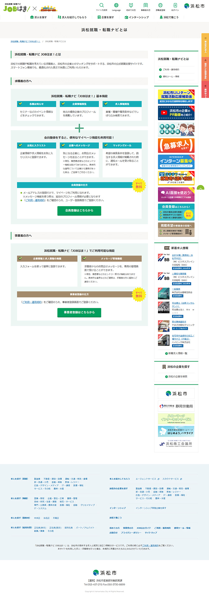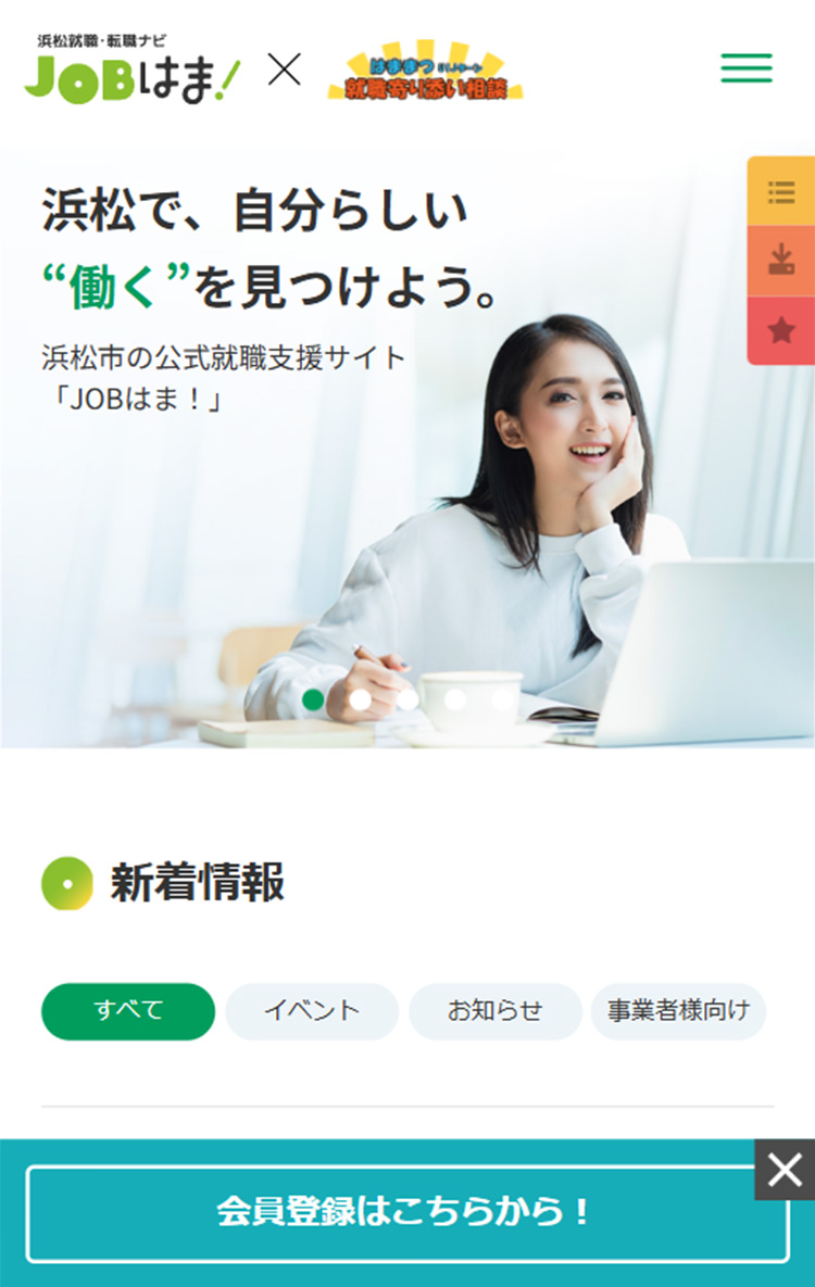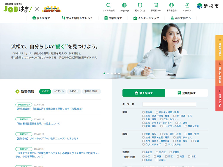 公式の就職・転職支援サイトを「浜松就職ナビ JOBはま!」として完全リニューアルしました。地元・浜松の事業者が企業情報や求人情報を手軽に登録できるように、オリジナルのシステムを開発。一方、U・I・Jターンなどを考える求職者専用のマイページ機能も充実させ、気になる情報のクリッピングや検索条件保存、希望案件の通知メールを実装しました。