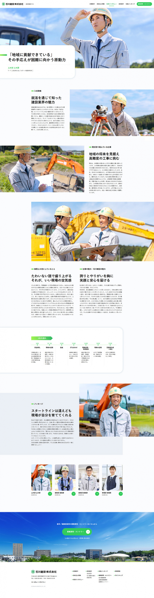 明治 35 年の創業以来、静岡県磐田市を拠点に地域とともに歩んできた石川建設株式会社様。100 年以上にわたり総合建設会社として地域に貢献されている同社の採用サイトをリニューアルしました。